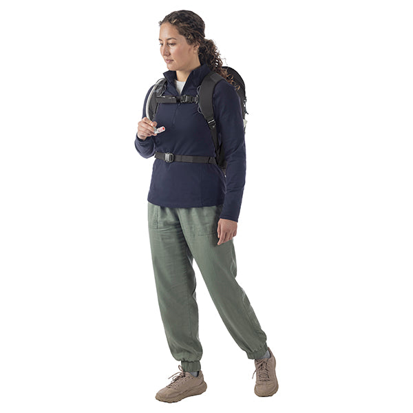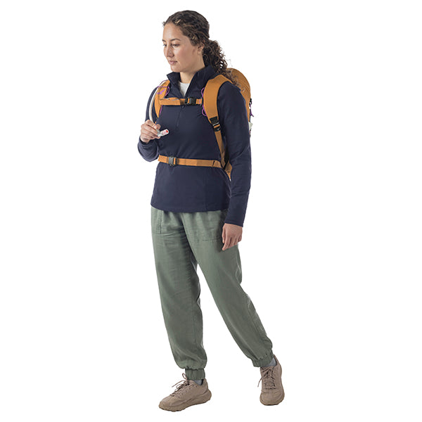 このバックパックは、海から回収されたリサイクル素材(GRS認証)を100%使用した耐久性のある設計です。環境に優しく、日常の通勤・通学から週末のアウトドアまで、この先何年もあなたの冒険に寄り添うタフな相棒となります。快適性も追求しており、クッション性のあるストラップ、緊急時に役立つホイッスル付きのチェストストラップ、収納可能なウエストベルトを装備し、体にしっかり固定して長時間背負っても疲れにくい設計です。内部のスリーブは、13インチのノートパソコンを安全に持ち運べるだけでなく、ハイドレーションリザーバーも収納できるため、ハイキング中の水分補給もスムーズに行えます。また、フロント部分の大きなドロップポケットは、上着やガイドブックといったかさばるものをサッと出し入れできる高い利便性を提供します。さらに、クレジットカードやIDなどの貴重品は、目立たない隠しパスポートポケットに安全かつ目立たずにしまっておけるため、旅先でのセキュリティも万全です。そして、夜間の走行に役立つバイクライト用ループも完備しており、自転車通勤や夜間の行動も安全にサポートします。キャリーバッグのハンドルに固定できるトロリースルーパスが付いているため、空港や駅でのスーツケースと一緒の移動も簡単。メインバッグに忍ばせておけば、旅先での観光用バッグや機内持ち込み用の手荷物としても活躍し、荷物を増やしたくないあなたの旅をさらに快適にする、汎用性の高いバックパックです。