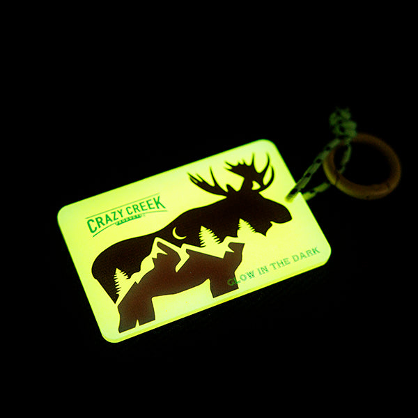 昼はスタイリッシュ、夜は光で安心。ヘラジカと山をミックスしたデザインの蓄光キーホルダーです。