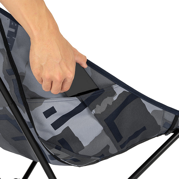 リラックスチェアでありながらもタクティカルラインならではの無骨さもあり、必要最低限に削ぎ落とされた装飾とシンプルなデザインが特徴で、収納力も抜群。ジッパー付きのポリエステル生地の収納袋をフレームに付けることで小物を入れることができ、さらに両サイドにあるカーゴポケットには携帯電話や小物等を収納可能です。背面にはベルクロが付いているので、ワッペンや夜間視認性を上げるための反射板などを付けてオリジナルなチェアにカスタマイズできます。
