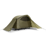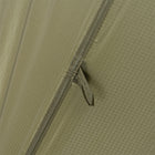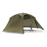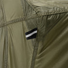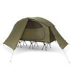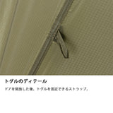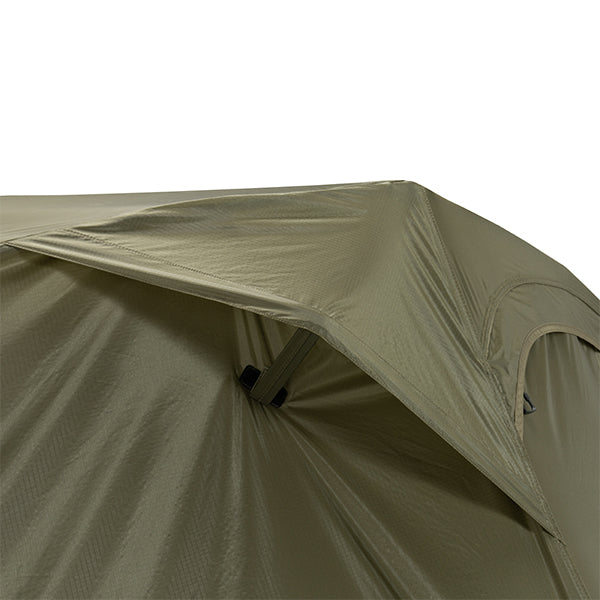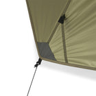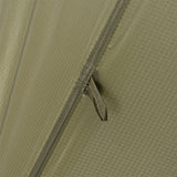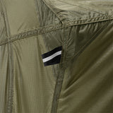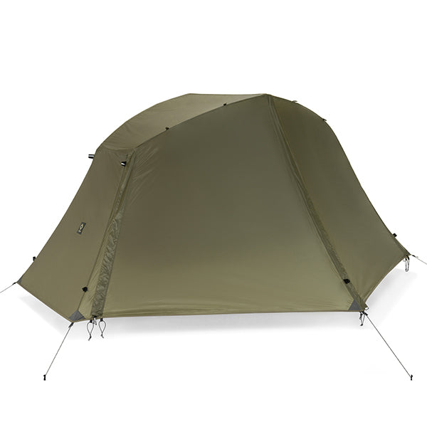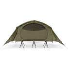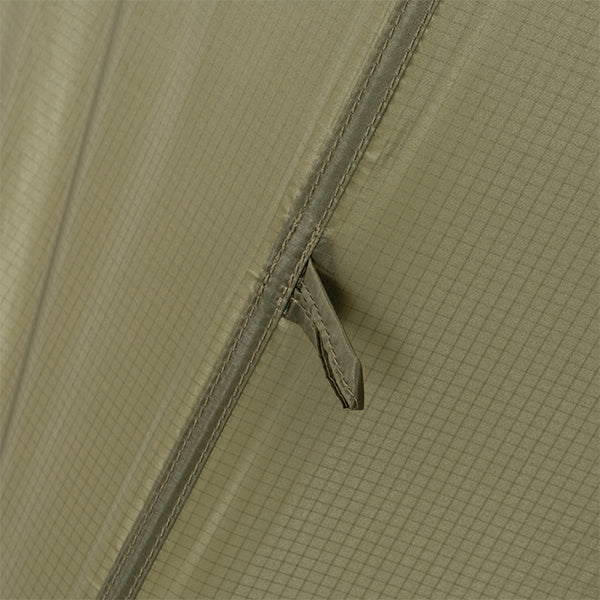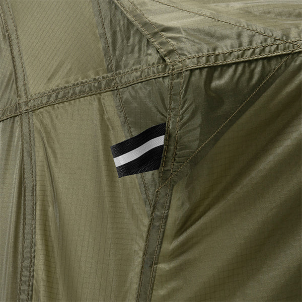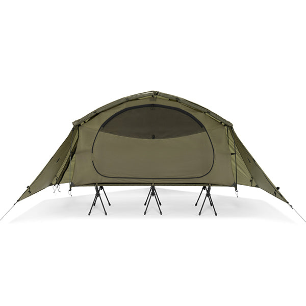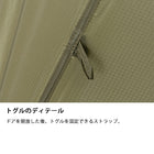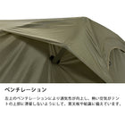 タクティカル コットテントソロを単体で野外で使用する際には必須のフライシートとなります。コットテントソロのフライの前面にある2つのドアを全て巻き上げて完全に開放する事ができます。また、ドアを同時に、またはそれぞれタープポール(タープポールは付属しておりません。)等で上げることで、別途タープを用意することなく、テントのフライをオーニングなどとして活用することができます。左上部にベンチレーションを搭載する事で通気性が向上し、熱い空気がテントの上部に滞留しないようにして、悪天候や結露に備えた構造となります。