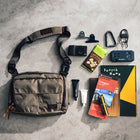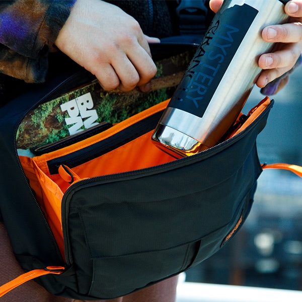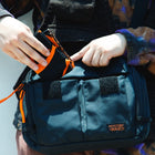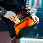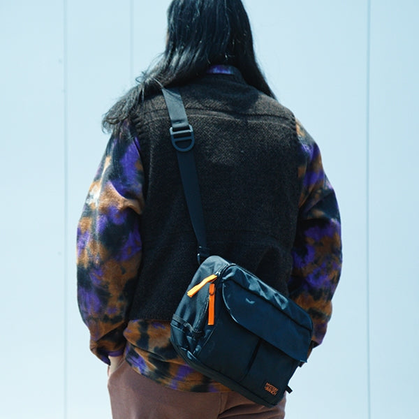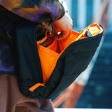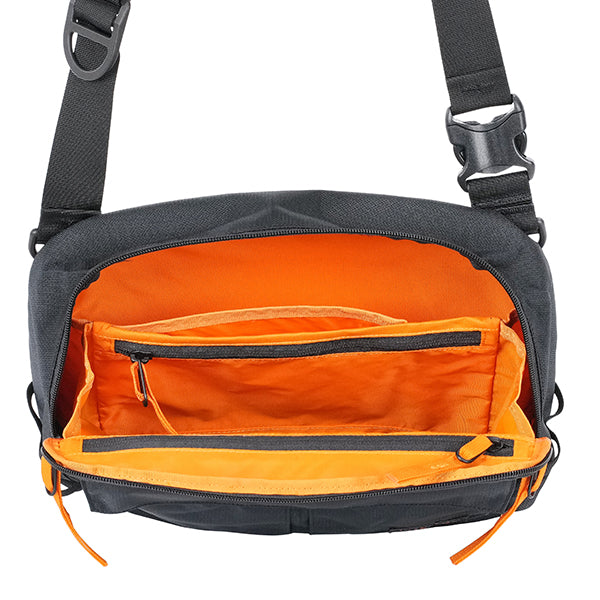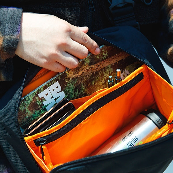 ベルクロで開閉できるフロントのアコーディオンポケットを2つ備え多くのアイテムを収納可能で、必需品を入れておくのに最適。背面には取り出しやすい、スリットポケットにタブレットなどを収納可能です。ジッパーの端に配置されたループにジッパープルを通すことによりちょっとした防犯になったり、サングラスなどを一時的にかけることができます。
