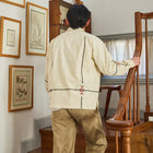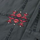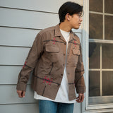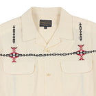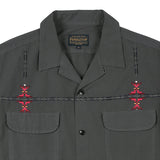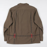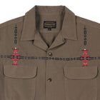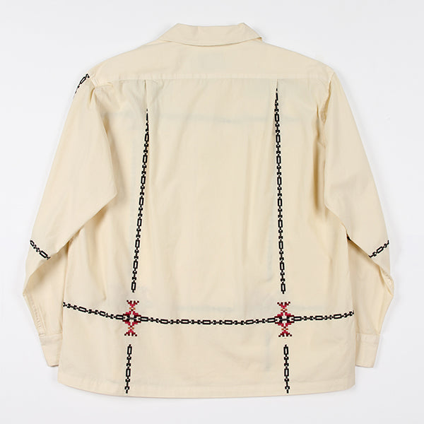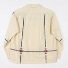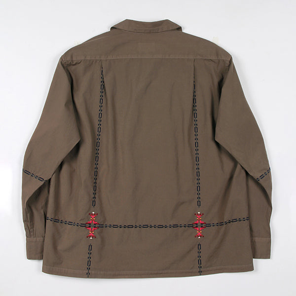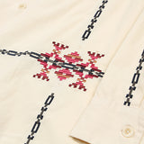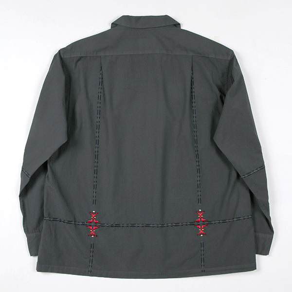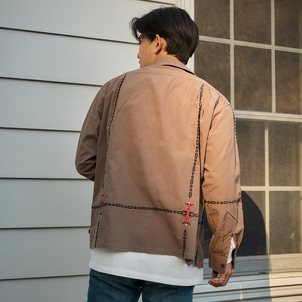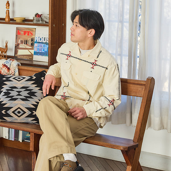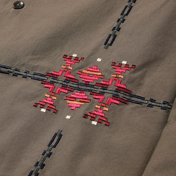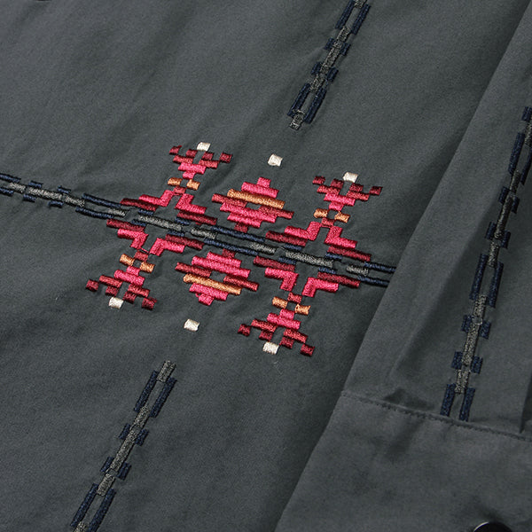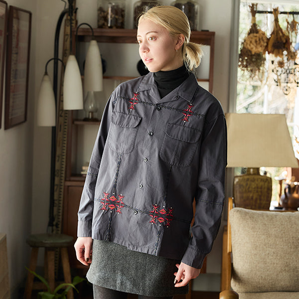 前身頃や袖、胸ポケットに沿って施された繊細かつ力強い刺繍とオープンカラーのリラックスした襟元が相まって、カジュアルながらもどこか品格を感じさせるデザインに仕上がっています。
