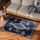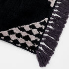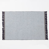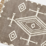 両端に施されたフリンジがさりげないアクセントとして効いていて、繊細なラインと大胆な幾何学模様が空間に深みを与えます。サイズは90cm×130cmと、玄関やソファ前、ベッドサイドなど使い勝手のいいちょうど良い大きさ。