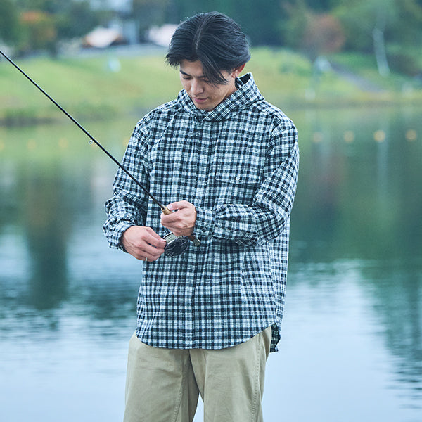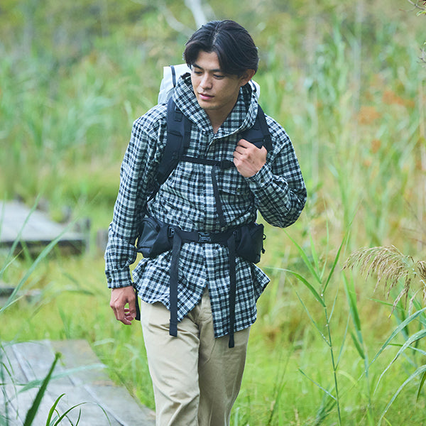 街でのスタイルにフィールドの機能をプラスした、“日常にちょうどいいウールシャツ”。フードを備えや新しいウールシャツは、比翼仕立てとスナップボタンによる軽快なデザインで、街にも馴染む新しいアウトドアシャツのかたちです。