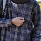 濃いネイビー、明るいスカイブルー、深いロイヤルブルーなど、さまざまな青を基調とした奥行きのある格子柄。異なるトーンの青が美しく織り重なり、落ち着いた中にも豊かな表情を生み出しています。