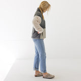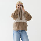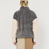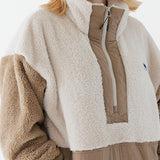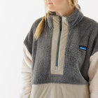 リサイクルポリエステル素材をを使用したフリースのアノラック。フードと裾野トリムがちょっとレトロな雰囲気です。裾は少しラウンドしていて、1枚羽織ればかわいいアウトドアミックスコーデの完成です。フロントはボタンを外せば大きく開くのでヘアスタイルの乱れも気にせず着脱することができます。