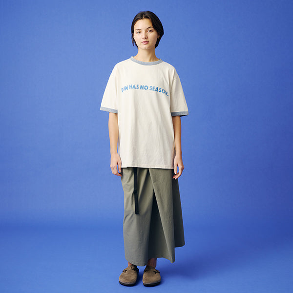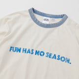 胸元にプリントされたフレーズは、「FUN HAS NO SEASON」。―楽しむことに、季節なんて関係ない。そんなKAVUらしい前向きなメッセージが光る一枚です。