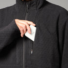 フリースジャケットに求められる基本的な保温機能を保ちつつ、熱い空気を放出し、体温調節を行う。まるで「呼吸をするフリースウェア」です。ゆったりとしたトレイル、テクニカルな登り、体温調節が課題となる行動初期の寒さなどを想定して作られています。動きに合わせて伸縮するストレッチ素材と、リアルタイムで体の動きに順応する温度調節機能を持つActiveTemp加工により、軽量で動きやすく、通気性に優れています。吸湿速乾性に優れ、必要に応じて熱を放出します。ジッパー付きの胸ポケットとハンドポケットは小物を安全に収納でき、UPF 50+のUVカット機能により、紫外線対策にも役立ちます。ミッドレイヤーウェアにありがちなフードを除外した事で、無駄にフードが二重、三重になる事なく着用時のストレスを軽減します。昔ながらのフリースのように嵩張らず、薄く柔らかな為パッキング時に1枚忍ばせたいジャケットです。