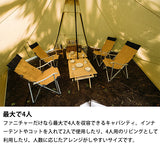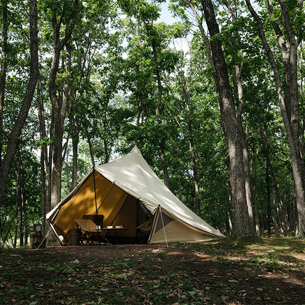 最近、どこのキャンプ場でもベージュのテントがとても多いですが、モーニンググローリーTCのベージュは、オフホワイトと言ってよいくらいの爽やかな淡い白です。また、TCならではの風合いや素材感もとても良いです。