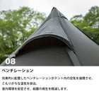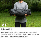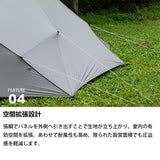 本体素材には50Dシリコーンポリエステルリップストップ、フレームには高強度なアルミポールとジュラルミンペグを採用。軽さを追求しながらも、厳しい環境下で求められる「軽量化」と「強度」を高い次元で両立しています。