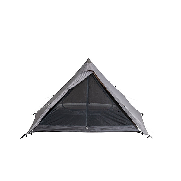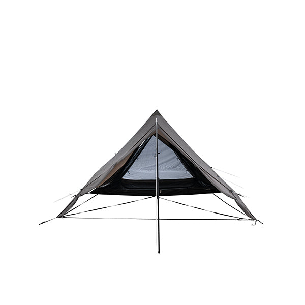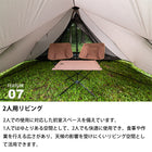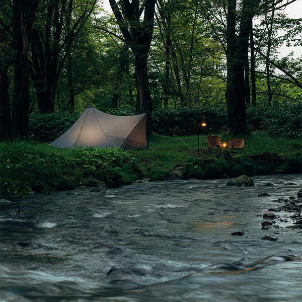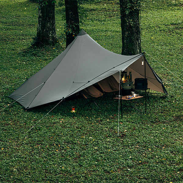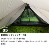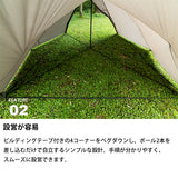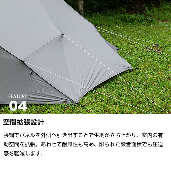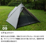軽量かつコンパクトに携行でき、場所を選ばず軽快に持ち出せる機動力を備えています。2人用メッシュインナーを標準装備し、コンパクトな外観以上に拡張性に優れた前室は、お気に入りのチェアやテーブルを自由に配置できるスペースを確保しています。