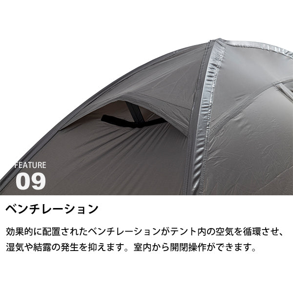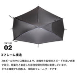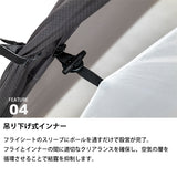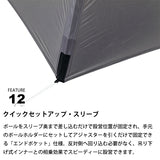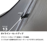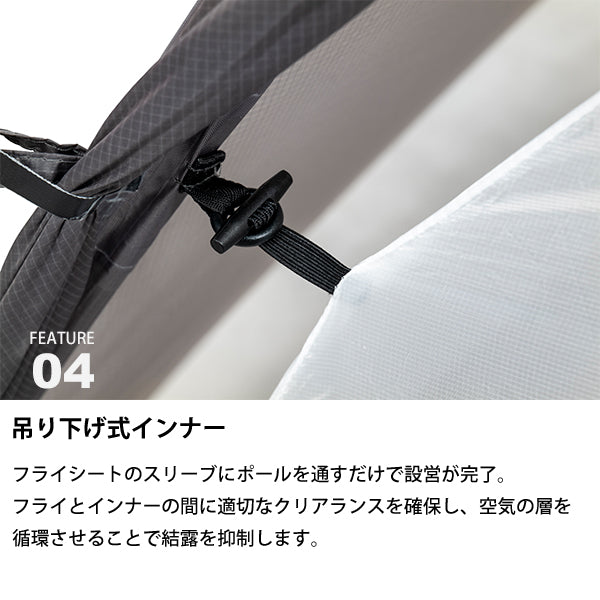 フライシートとインナーテントを一体化させた「インナー吊り下げ式」を採用し、ポールをスリーブに通し、立ち上げるだけで設営が完了できます。直感的な設営システムにより、悪天候下においても、素早く確実なシェルター形成を可能にします。