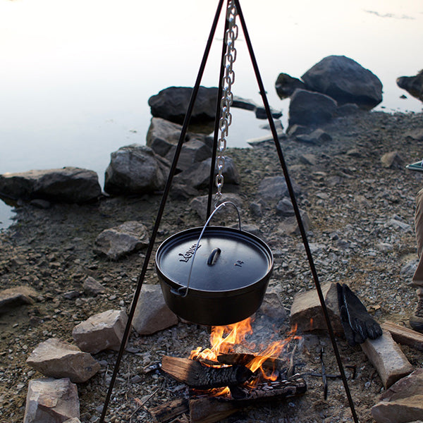 120年余りの歴史があるLODGE(ロッジ)社の三脚です。ダッチオーブンを焚火や炭火の上に吊るすことができます。