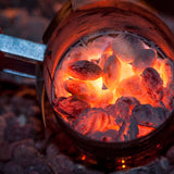 平らにまんべんなく敷いた炭(豆炭)の上に四足を安定するように置きます(四本足は炭に乗らないようにします)。 熱量は炭や豆炭の量によって変わりますので、調理しながら調整をします(トングなどで炭を抜いたり、追加したりします)。鍋が充分に温まったら油を敷いて、食材を入れ、調理して下さい。