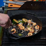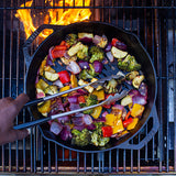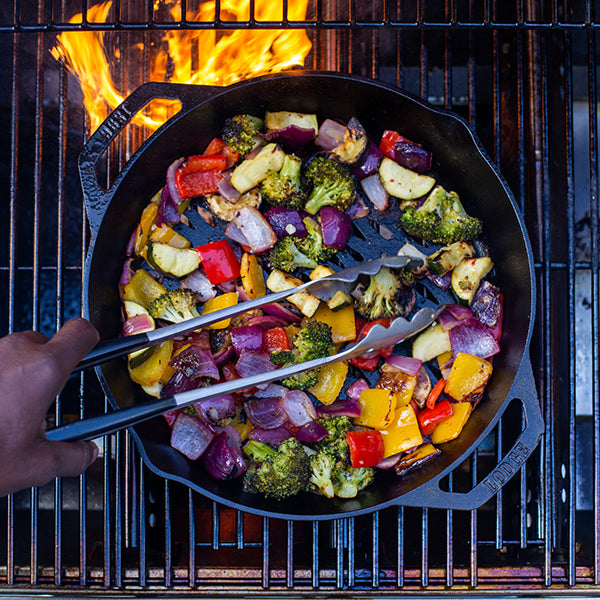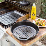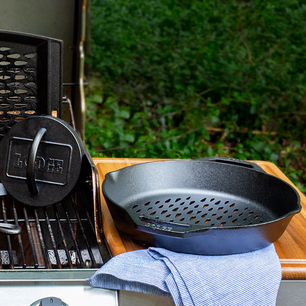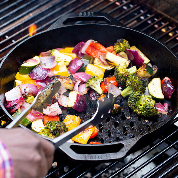 このグリルバスケットを使えば、野菜や魚を入れておき、かき混ぜたり、ひっくり返したり、炒めたりしても従来の焼き網のように食材を下に落とす心配はありません。また、ロッジの特徴的なティアドロップデザインの穴のおかげで、おいしいグリルフレーバーを料理に吹き込むことができます。