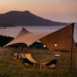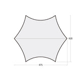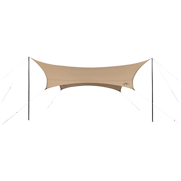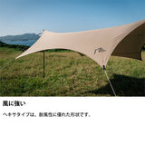 ※シンセティック(化繊)生地はコットン生地に比べると生地自体の水分含有量が低く、焚火等の火の粉で生地に穴があきやすい為、タープ設置の際は必ず火元から離れた場所に設置するようお願いします。